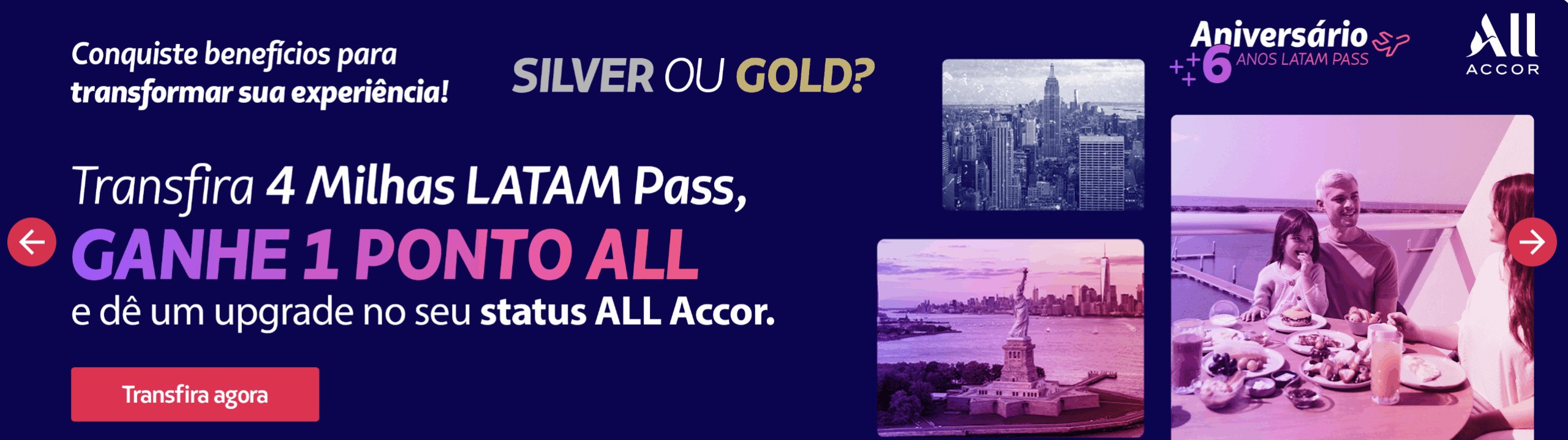 Mega oportunidade! Em comemoração aos 6 anos do LATAM Pass, o programa está oferecendo desconto no fator de conversão para o ALL Accor e possibilidade de se tornar cliente Silver ou Gold no programa hoteleiro dependendo da quantidade de pontos enviados. A oferta é válida até sexta-feira (3). Confira!