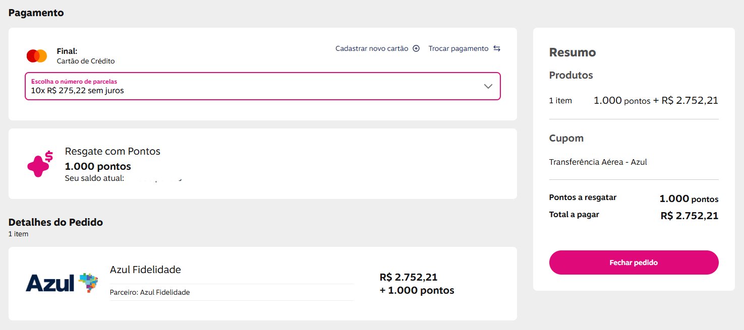 - 99.000 pontos restantes na modalidade pontos + dinheiro: R$ 2.752,21