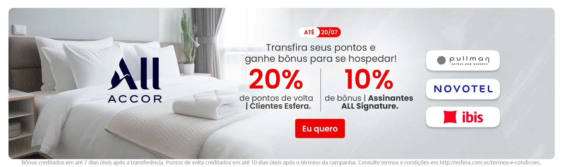 Boa oportunidade para quem está planejando uma próxima hospedagem! Com a nova oferta entre a Esfera e o ALL, é possível receber 20% dos pontos transferidos de volta. Além disso, assinantes do clube ALL Signature ganham um bônus extra de 10% em pontos no programa hoteleiro.
