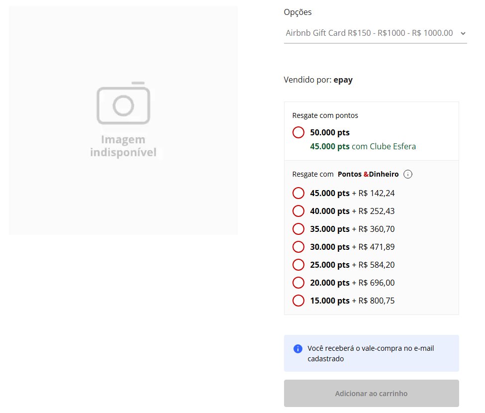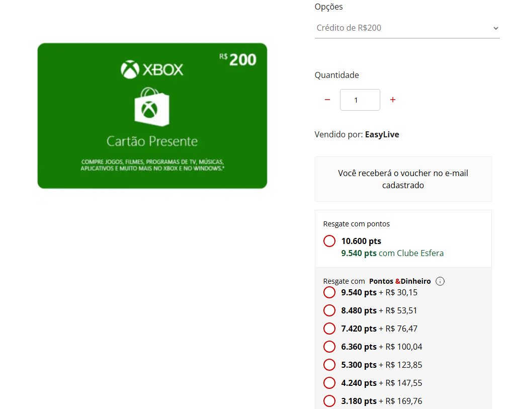 Os vale-compras são uma opção prática de presente, uma vez que a pessoa pode decidir com o que vai gastar. Na Esfera, você encontra diversas lojas parceiras que oferecem os vales. Além disso, é possível optar por realizar o pagamento via ‘Pontos+Dinheiro’, onde você pode escolher o número de pontos que deseja gastar ou completar o seu saldo para um possível resgate.