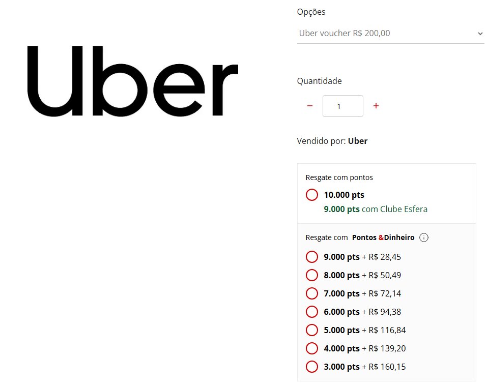 Além de realizar o resgate dos vales por pontos, também é possível resgatá-los com o método de pagamento via ‘Pontos+Dinheiro’. Sendo assim, você tem mais liberdade para escolher como utilizar os seus pontos ou até mesmo realizar um resgate desejado caso você não tenha o saldo completo. Confira abaixo o exemplo, onde está sendo resgatado um vale de R$ 200 na Uber utilizando o método: