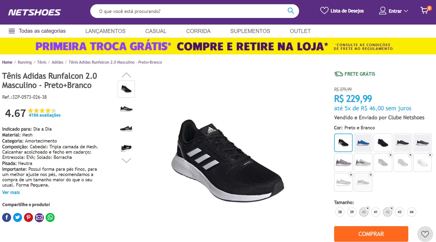 Ao selecionar um produto, não é possível ver a quantidade de pontos que você receberá. Atente-se que só são elegíveis ao acúmulo bonificado os itens vendidos e entregues pela Netshoes (identificado como Clube Netshoes):