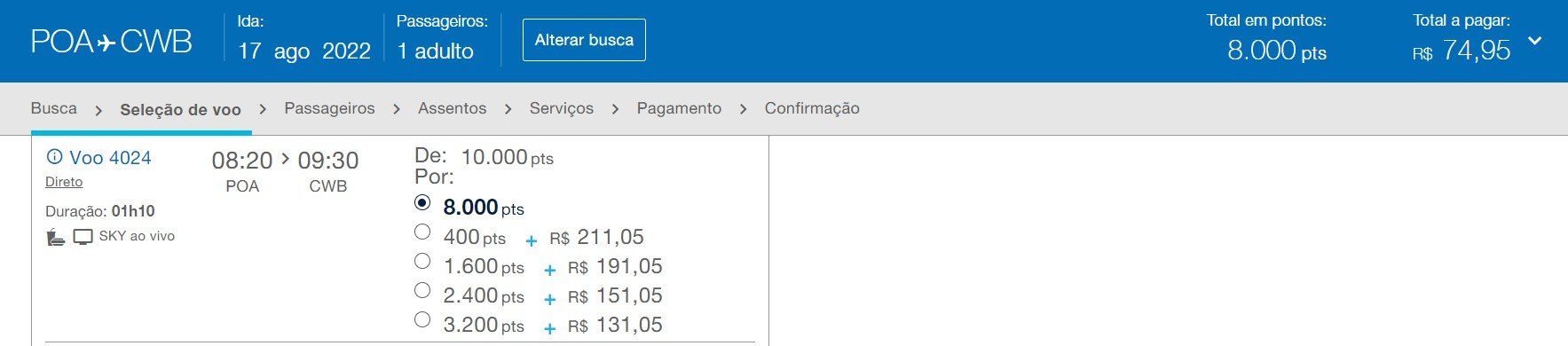 Confira abaixo um exemplo de resgate para quem possui o cartão Azul Itaucard Platinum. Repare que a passagem tem o custo de 10.000 pontos o trecho, porém, com o desconto de 20%, está saindo por 8.000 pontos.