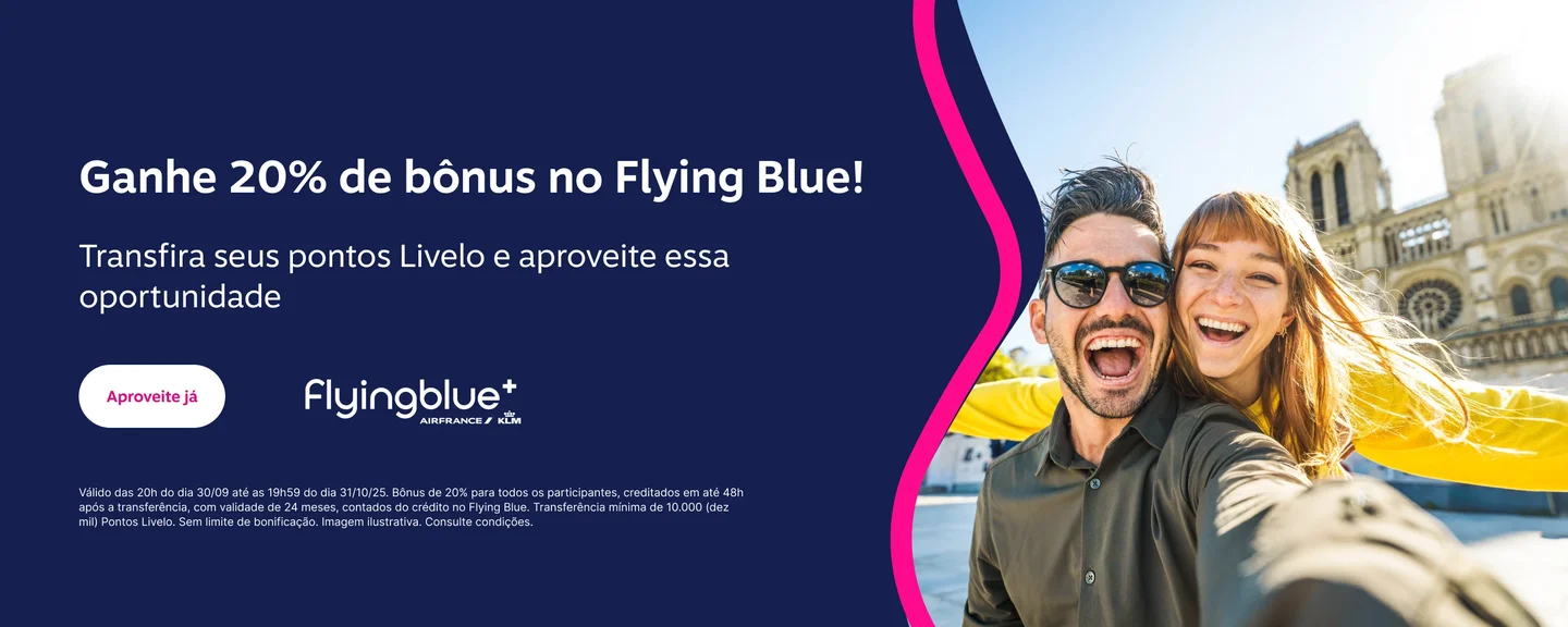 Boa oportunidade para você transferir pontos da Livelo para o Flying Blue, já que vai receber uma bonificação de 20% de bônus. Vale lembrar que, nesta oferta, a bonificação contempla todos os usuários da Livelo, independentemente de serem assinantes do Clube ou não.