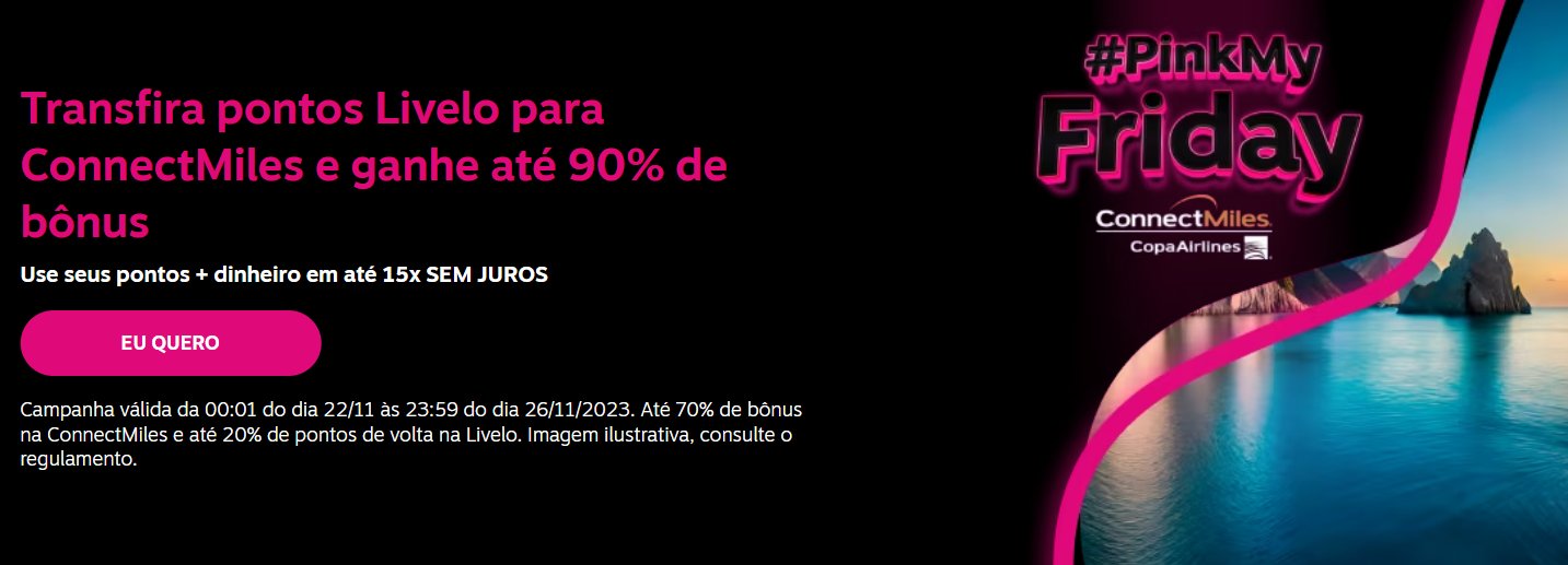 Para a bonificação, a transferência mínima deve ser de 3.000 pontos Livelo. Além disso, vale frisar que a transferência para o ConnectMiles conta com uma paridade de 3:1, isto é, a cada 3.000 pontos Livelo, você receberá 1.000 milhas no programa de fidelidade da Copa Airlines.