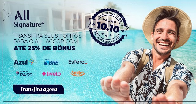 Assinantes do ALL Signature que transferirem milhas ou pontos de qualquer programa parceiro (Azul Fidelidade, BRB, Esfera, LATAM Pass, Livelo ou Smiles) para o ALL Accor até hoje (17), ganharão até 25% de pontos Reward bônus.