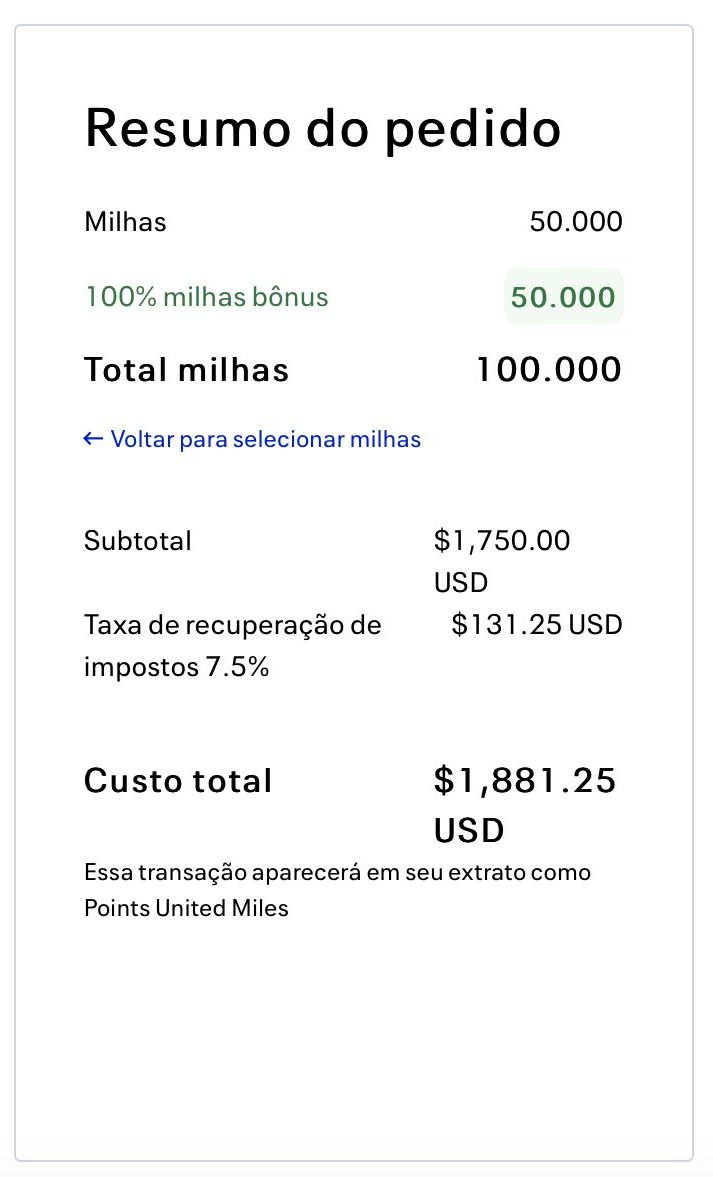 Na nossa simulação, foi possível realizar a compra de até 50.000 milhas com 100% de bônus. Com as milhas a mais, o custo para cada 1.000 milhas será de US$ 18,87, não considerando a incidência do IOF, claro. A transação possui uma taxa de serviço de 7,5%. Veja o exemplo abaixo: