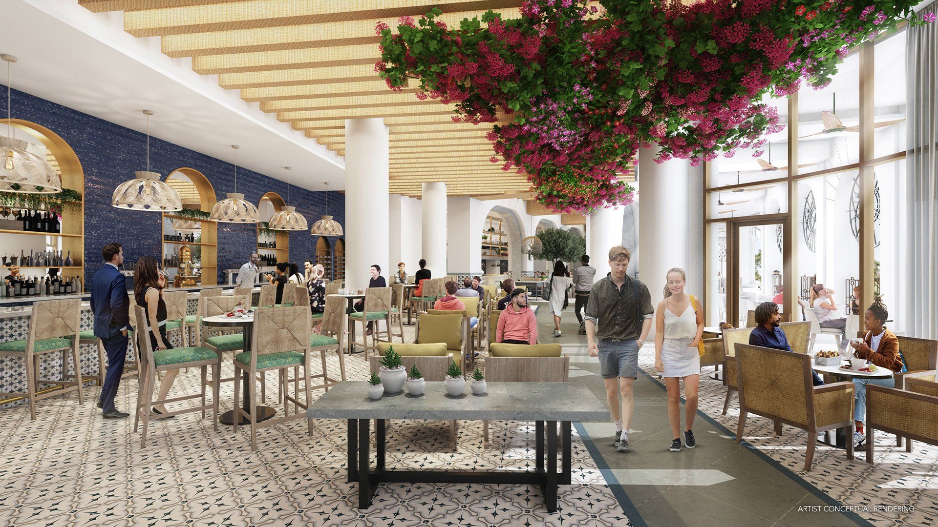 - Flora Taverna: restaurante de café da manhã, almoço e jantar, com um lobby bar, apresentando cozinha de estilo aberto. Os pratos são mediterrâneos, e o local possui fornos de pizza e assentos ao ar livre com vista para o Celestial Park;