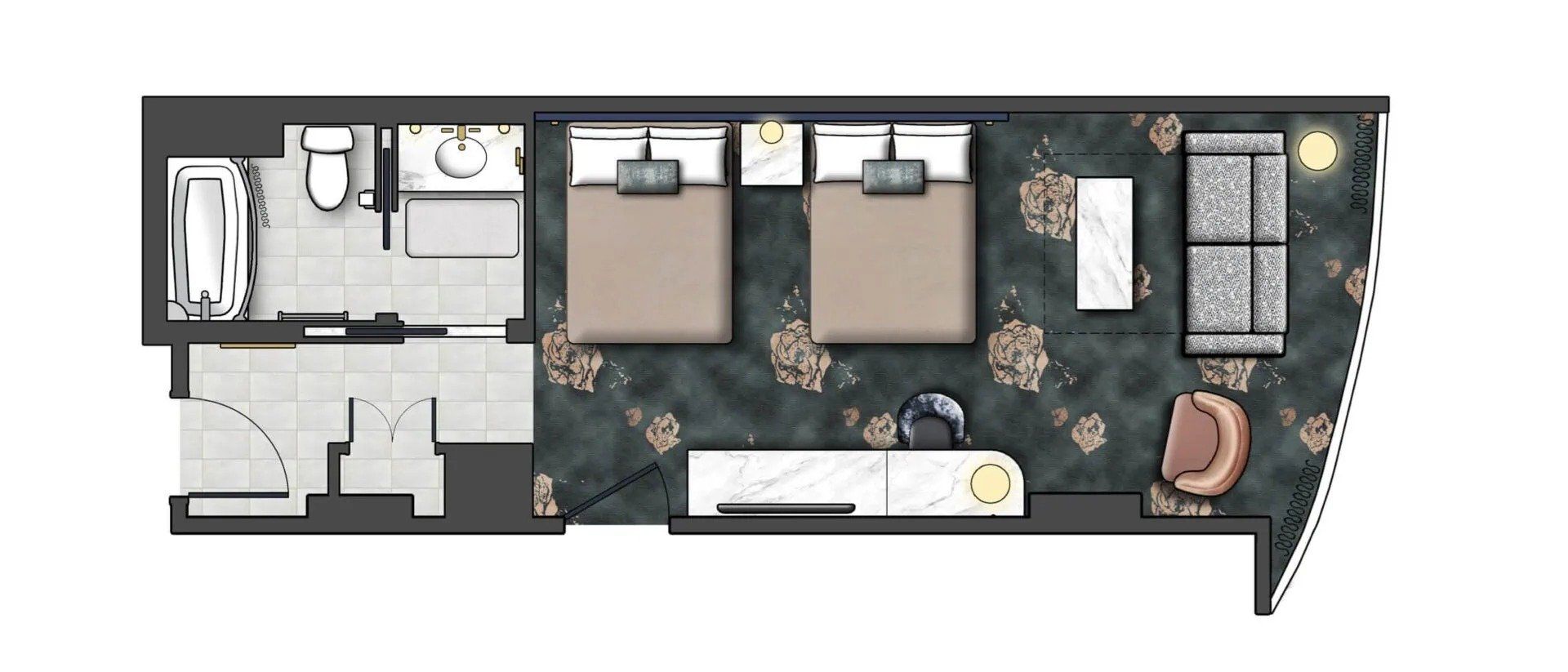 - Quartos serenos e suítes espaçosas: quartos e suítes que trazem a tranquilidade de um jardim, com muitos deles oferecendo vistas do Epic Universe. As suítes infantis são temáticas do filme Como Treinar o Seu Dragão, onde as crianças podem se sentir voando para os céus e descansando entre dragões, em um local colorido e inspirado na vila viking de Berk;