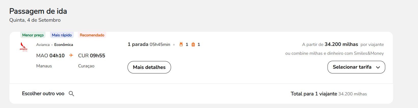 - Custo da passagem em milhas: 34.200 milhas Smiles