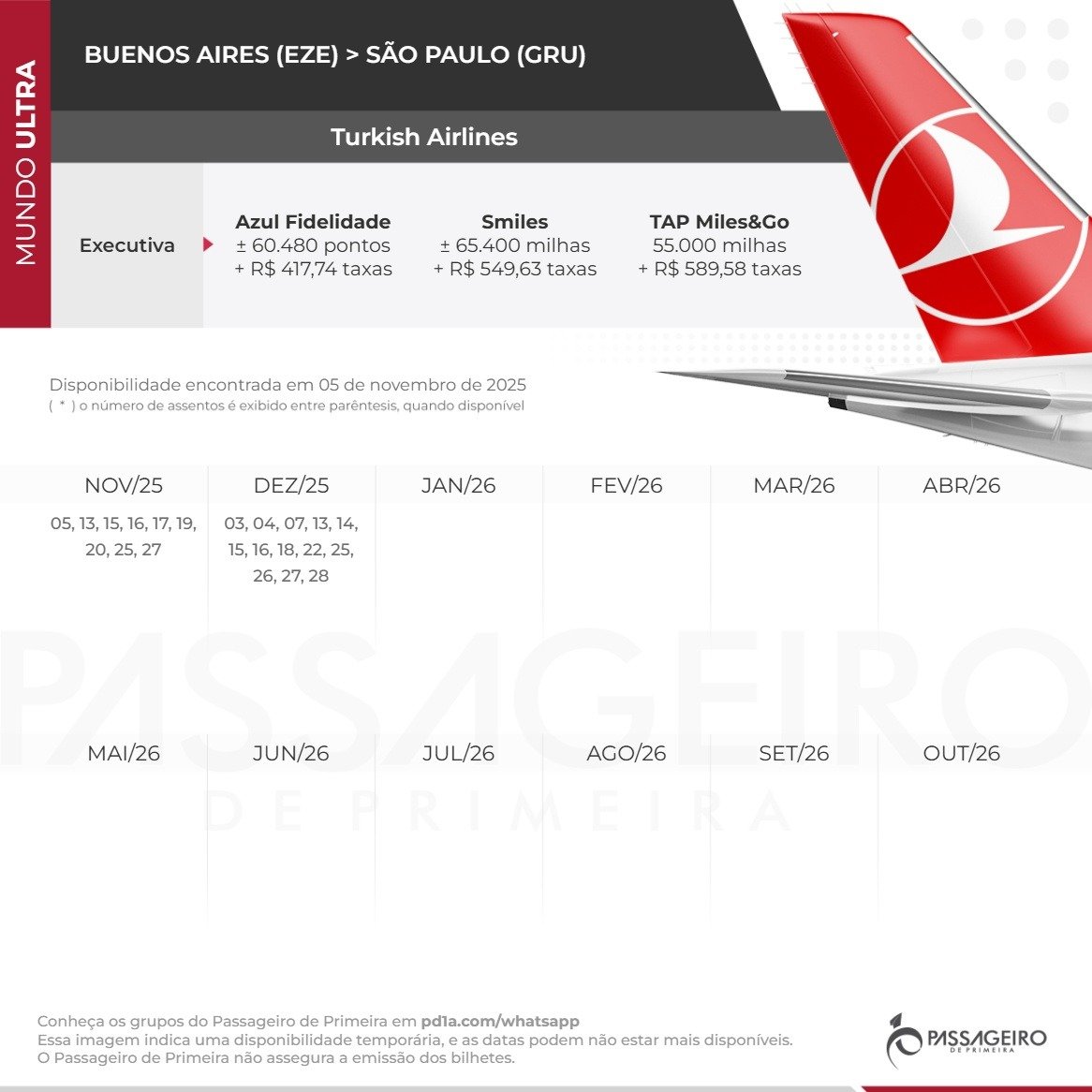 Alerta direto dos Grupos do PP no WhatsApp! 🚨 Encontramos disponibilidade de bilhetes entre Buenos Aires (EZE) e São Paulo (GRU) em Classe Executiva. Os voos são operados pela Turkish Airlines e a emissão pode ser feita a partir de 60.480 pontos Azul + taxas o trecho. Além disso, caso você não tenha pontos para realizar a emissão, é possível transferir pontos Livelo para o programa fidelidade com até 95% de bônus, e emitir o trecho a partir de R$ 774,14 + taxas. Confira!