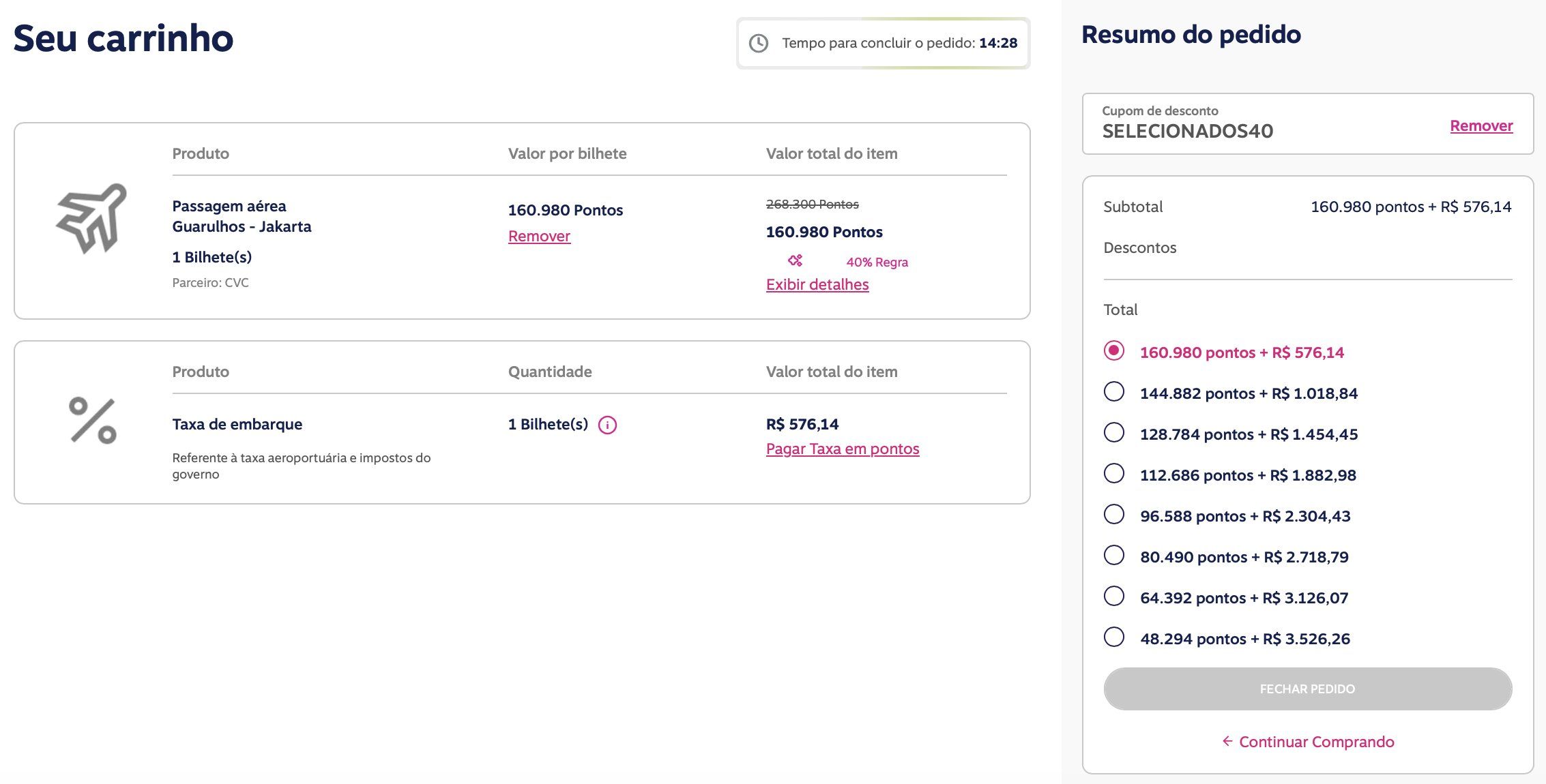 - Quantidade de pontos que precisará comprar: 160.980 – 17.000 = 143.980 pontos