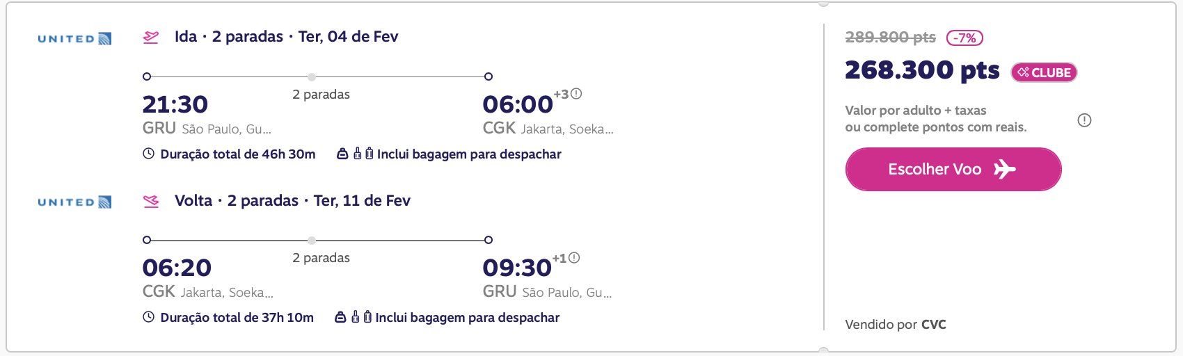 O exemplo abaixo se refere a uma passagem de ida e volta de São Paulo (GRU) a Jacarta (CGK) de 4 de fevereiro a 11 de fevereiro de 2024:
