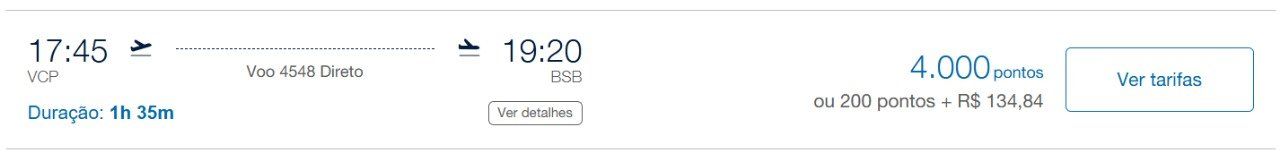 Confira abaixo um trecho para Brasília (BSB) com a Azul por 4 mil pontos: