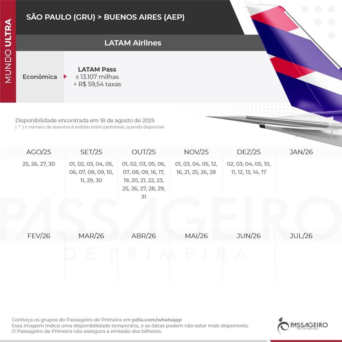 Alerta direto dos Grupos do PP no WhatsApp! 🚨 Em nossas pesquisas, encontramos disponibilidade de bilhetes de ida e volta entre São Paulo (GRU) e Buenos Aires (AEP). Os voos são operados pela LATAM Airlines e a emissão pode ser feita a partir de 13.107 milhas LATAM Pass + taxas. Se você não tem milhas suficientes, pode aproveitar a transferência bonificada com pontos + dinheiro da Livelo e pagar a partir de R$ 375,02 no trecho. Confira!