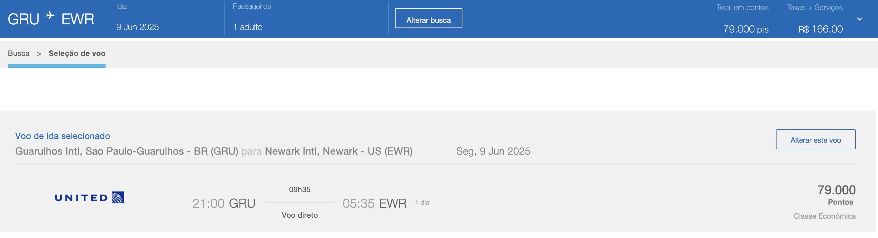 Valor por trecho: 79.000 pontos + R$ 166,00 em taxas