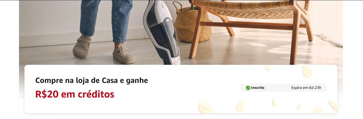 Na página principal da Amazon, procure pelo card da promoção. Clique em “Ganhe créditos completando missões”. A seguir, escolha a missão desejada e complete a inscrição. Como exemplo, vou escolher a missão “Casa”.