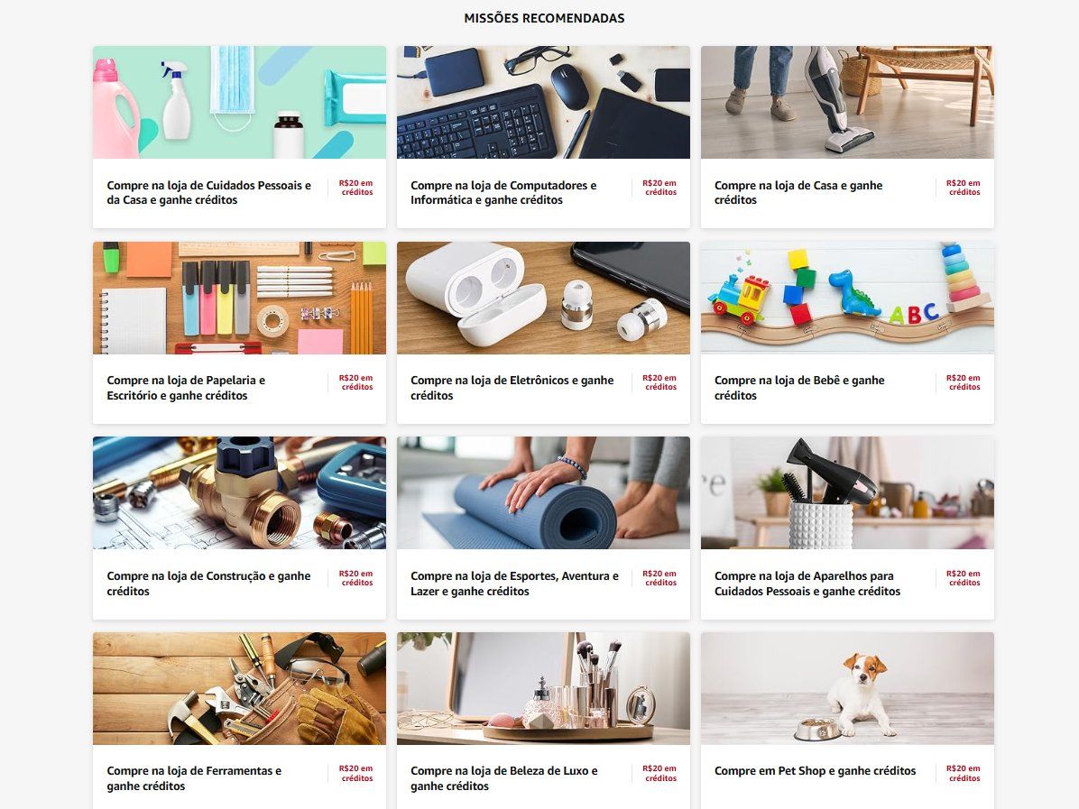 As missões são ações específicas que o cliente deverá concluir para ganhar créditos. Cada missão vale um crédito de R$ 20,00 para ser utilizado em compras futuras na Amazon a partir de R$ 40,00 e cada participante só poderá concluir uma por vez.