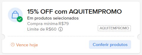 - 15% off, chegando até R$ 60 de desconto, em compras a partir de R$ 79, com o cupom ‘AQUITEMPROMO‘ [sem aspas]