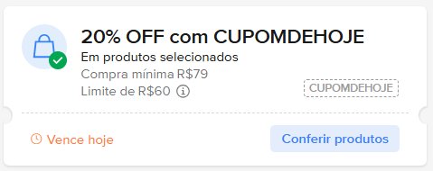 - 20% off, chegando até R$ 60 de desconto, em compras a partir de R$ 79, com o cupom ‘CUPOMDEHOJE‘ [sem aspas]