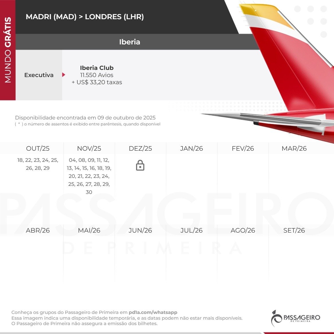 Alerta direto dos Grupos do PP no WhatsApp! 🚨 Encontramos disponibilidade de bilhetes de ida e volta entre Madri (MAD) e Londres (LHR), operadas pela Iberia em Classe Executiva. Em algumas frequências, o trajeto é realizado no moderno Airbus A350. As passagens podem ser emitidos a partir de 11.550 Avios + taxas por trecho. Confira!