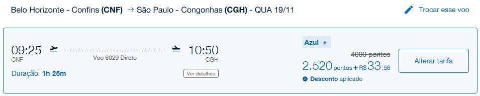 - 99.000 pontos restantes na modalidade pontos + dinheiro: R$ 2.375,29