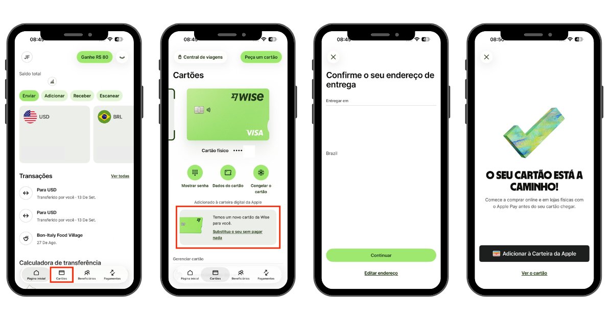 O processo para obter o novo cartão é simples e totalmente gratuito pelo aplicativo da Wise. Basta acessar a sua conta Wise, entrar na aba “Cartões” e selecionar o banner que oferece a substituição gratuita, depois é só confirmar sua senha e seu endereço de entrega, como você pode acompanhar abaixo: